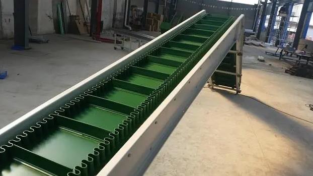 1、帶裙邊的輸送皮帶:裙邊皮帶輸送機(jī)的輸送帶的結(jié)構(gòu)形式為中間低的平面皮帶輔以兩邊高的類似裙邊的橡膠帶組合而成,這種設(shè)計,能夠較好的防止物料灑落;其平面皮帶上,通常在一定的間距會有一定高度的橡膠擋板,這種結(jié)構(gòu)能夠很好的將物料輸送到較高位置。